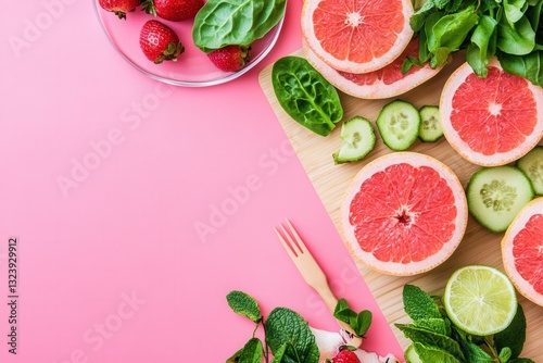 Fresh Fruits and Greens on Pink Background with Wooden Utensils