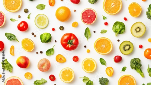 Fresh fruits and vegetables arranged in a vibrant, colorful pattern on a clean white background