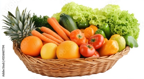 Fresh fruits and vegetables in a basket. A variety of colorful produce, including oranges, lemons, grapefruit, pineapple, carrots, zucchini, peppers, tomatoes, and lettuce