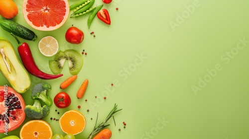 Fresh Fruits and Vegetables on Green Background