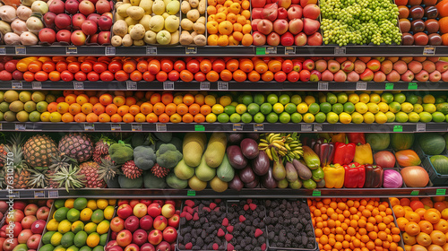 fresh fruits and vegetables on shelves in supermarket store, food shopping concept, food business