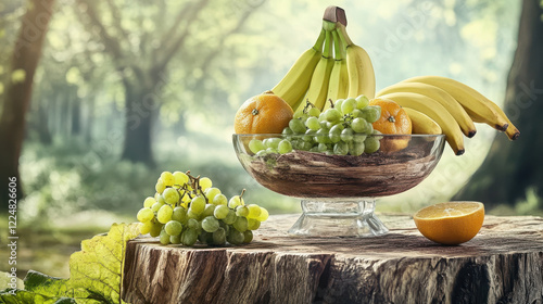 Fresh Fruits Arranged in a Bowl on a Wooden Stump Under Sunlight in a Tranquil Forest Setting
