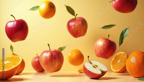 Fresh fruits composition. Red apples and oranges levitate on beige background. Half of apple in foreground. Healthy vibrant fruits concept. Food composition with shadow. Nutrition still life. Diet