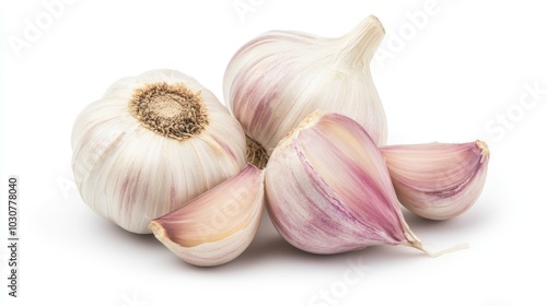 Fresh garlic bulbs and cloves arranged on a white background, showing their natural texture and colour.