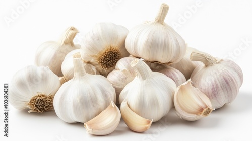 Fresh garlic bulbs separated and featured on a plain white backdrop