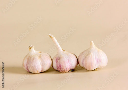 Fresh garlic on a beige background. Ostrich spice for eating. Horizontal image.