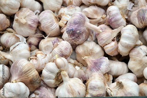 Fresh garlic on market table. Vitamin healthy vegetables.