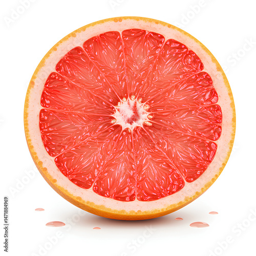 Fresh grapefruit half isolated on white background. Citrus fruit slice mockup, top view. Juicy tropical fruit template for healthy diet and kitchen visuals.
