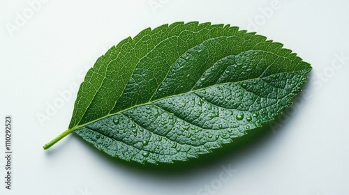 Fresh green alm leaf with water droplets isolated on a clean white background showcasing natural texture and vibrant color.