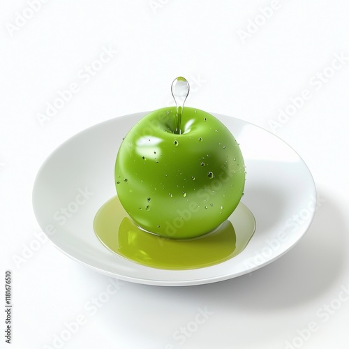 Fresh Green Apple with Water Droplets on White Plate Featuring Glossy Surface and Vibrant Color Accents