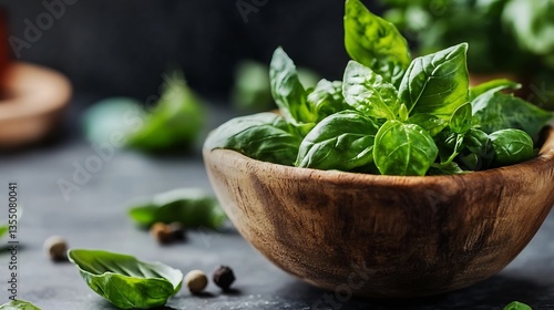 Fresh green basil leaves in a rustic wooden bowl ready for cooking or garnishing dishes : Generative AI