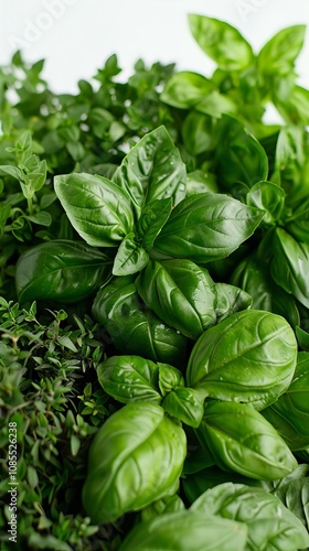 Fresh green basil leaves nestled among aromatic herbs for culinary delights.