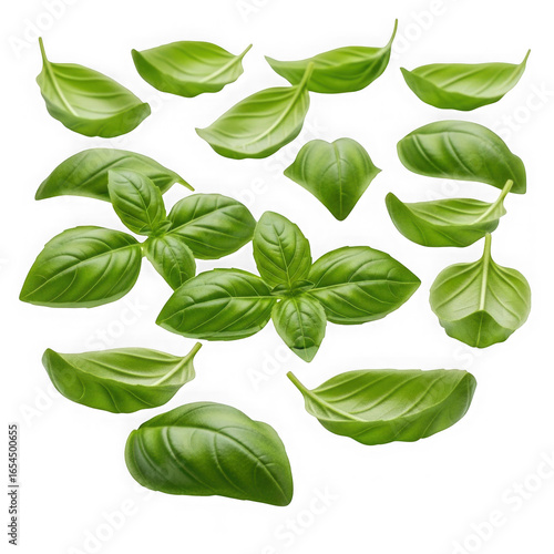 Fresh green basil leaves scattered overhead view culinary ingredient transparent background