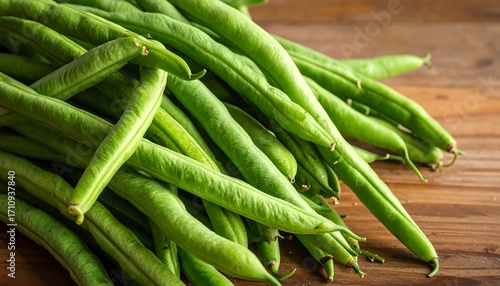 Fresh green beans, vibrant and plentiful, arranged closely on a wooden surface.