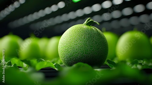 Fresh green cantaloupe melon with textured rind on dark background with dramatic lighting and selective focus, surrounded by green leaves and blurred melons.