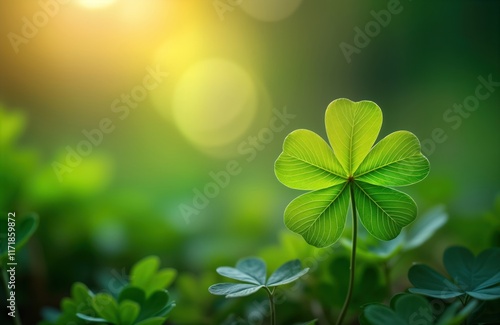 Fresh green clover leaf closeup against blurred background. Sunny light and lens flare enhance the image. Natural spring or summer scenery. Beautiful image for Valentine Day background.