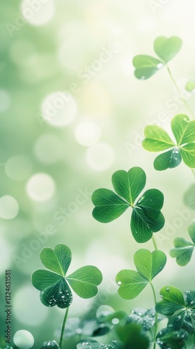 Fresh green clover leaves with dewdrops on a soft bokeh background. Saint Patrick's Day, St Paddy's Day, St Patty's Day - Irish National Holiday and Cultural Celebration