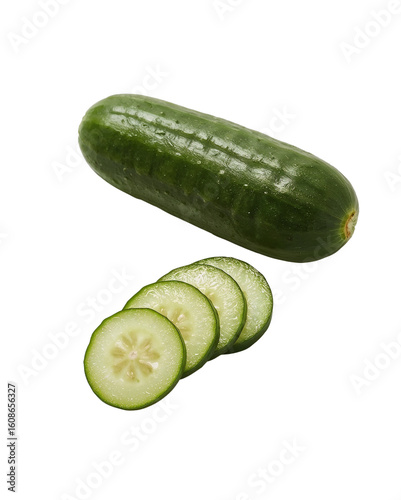 Fresh green cucumber isolated, sliced and whole, against a visually striking transparent