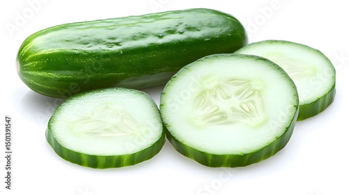 Fresh Green Cucumber Slices Displayed with Whole Cucumber Isolated on White Background