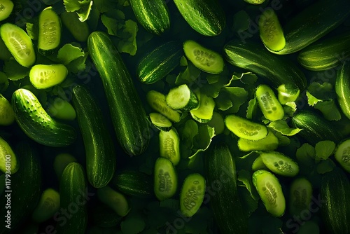 Fresh Green Cucumbers and Zucchini: Sliced and Whole, Arranged with Leaves, Dark Background