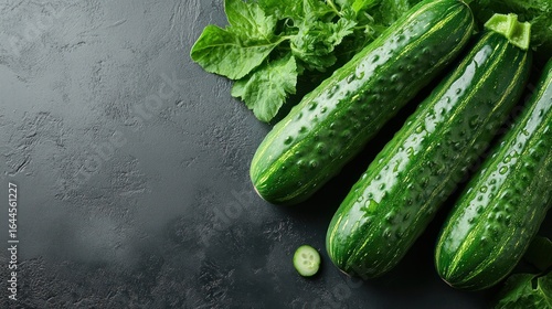 Fresh green cucumbers and zucchini with leaves on dark background
