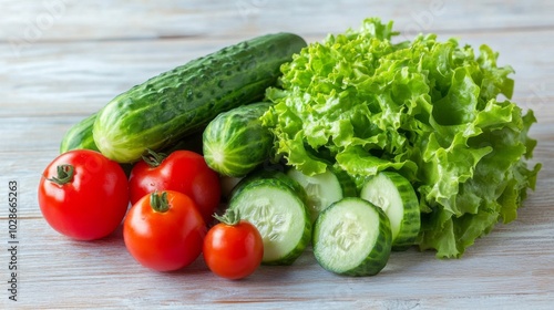 Fresh Green Cucumbers, Tomatoes, and Lettuce on Wooden Surface