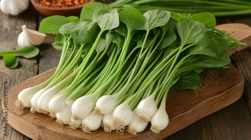 Fresh Green Garlic Chives on Wooden Cutting Board Asian Cuisine Ingredient