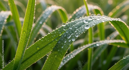 Fresh green grass covered with sparkling morning dew in soft natural light