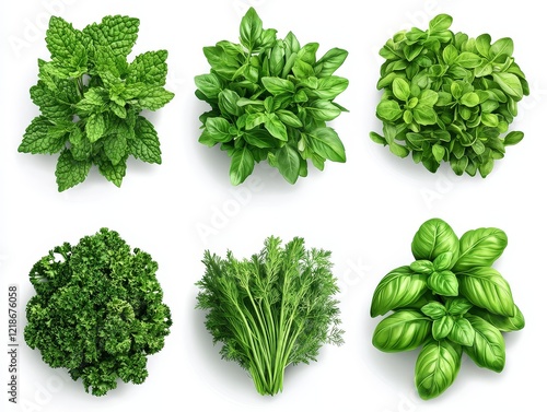Fresh Green Herbs Collection Mint Basil Parsley Dill Isolated on White Background