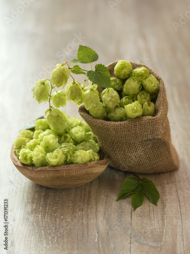 Fresh green hops in burlap bag.