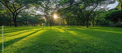 Fresh green lawn background with trees in soft morning light at local public park.