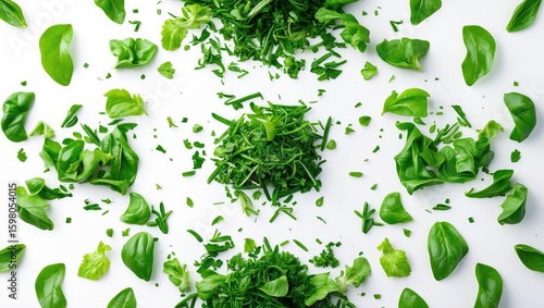 Fresh green leaves and herbs arranged in a circular pattern on a white background.