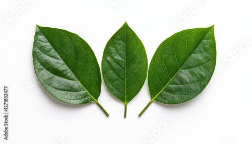 Fresh green leaves arranged on a white background, symbolizing nature and tranquility.