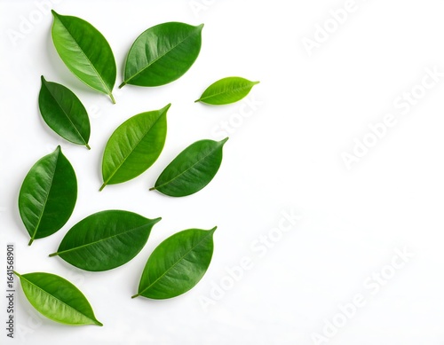 Fresh Green Leaves Arrangement on a White Background, Ideal for Natural Themes