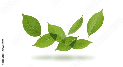 Fresh green leaves composition floating on a white background, conveying serenity and growth.