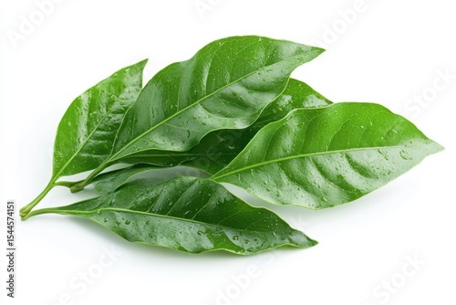 Fresh green leaves glistening with morning dew symbolizing new growth on white on white background. Generative Ai