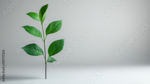Fresh Green Leaves on a Stem Against a Soft Gray Background for Use in Nature, Environmental, and Health-Themed Projects