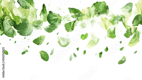 Fresh green leaves splash across a white canvas, embodying the essence of nature's vibrant palette in a dynamic, lively arrangement on transparent background