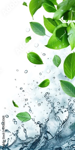 Fresh green leaves with water droplets splashing on a white background, creating a refreshing and natural scene.