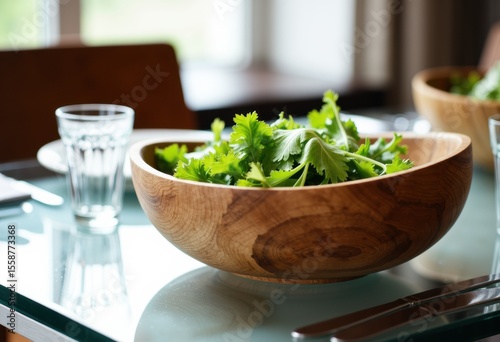 Fresh green lettuce in a wooden bowl on a glass dining table with natural light