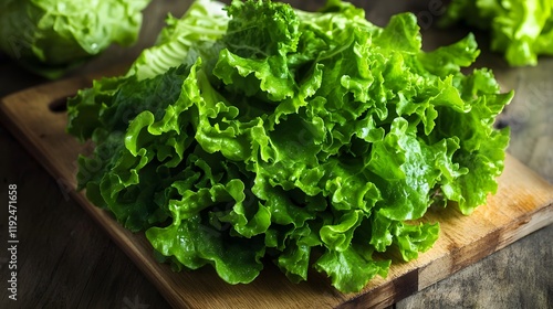 Fresh Green Lettuce Leaves on Wooden Board