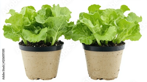 Fresh Green Lettuce Plants in Clay Pots on White Background