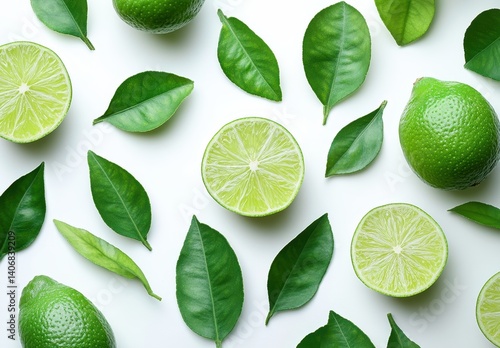 Fresh Green Limes and Leaves Arranged Artistically on a White Background for Culinary or Beverage Concepts