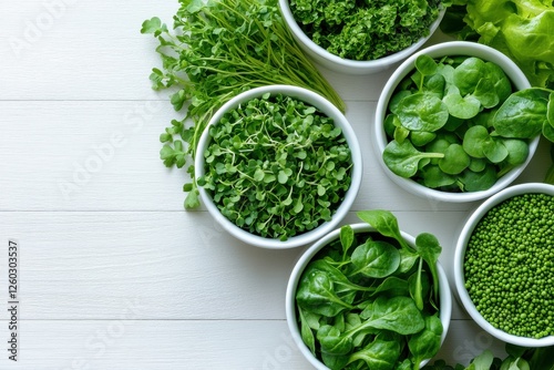 Fresh green microgreens and leafy vegetables in white bowls on wooden table.