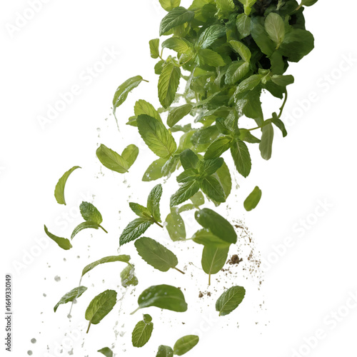 Fresh green mint leaves falling with water splash isolated on transparent background, creating a refreshing and vibrant cascade