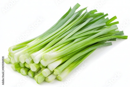 Fresh green onions stacked neatly on a white background, ideal for culinary use