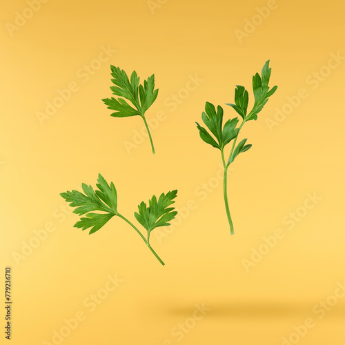Fresh green Parsley herb falling in the air isolates on yellow background