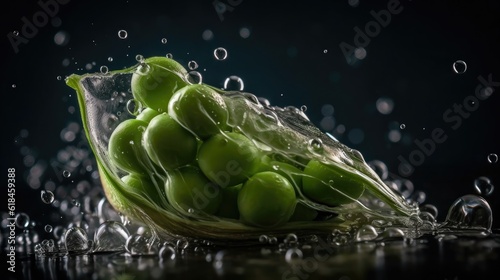 Fresh Green Pea hit by splashes of water with black blur background