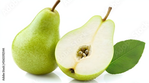Fresh Green Pear Half with Leaf and Whole Pear Isolated on White Background