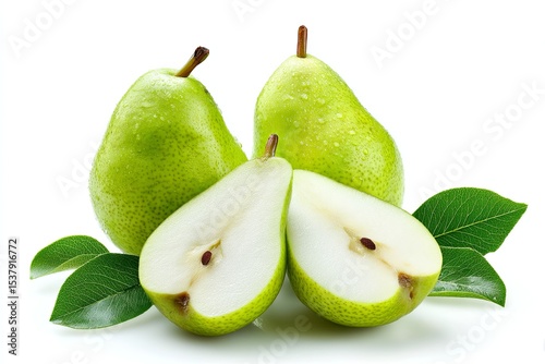 Fresh Green Pears Collection Showing Whole Pears, Sliced Pears, and Pear Halves with Green Leaves on White Background for Healthy Food Concepts